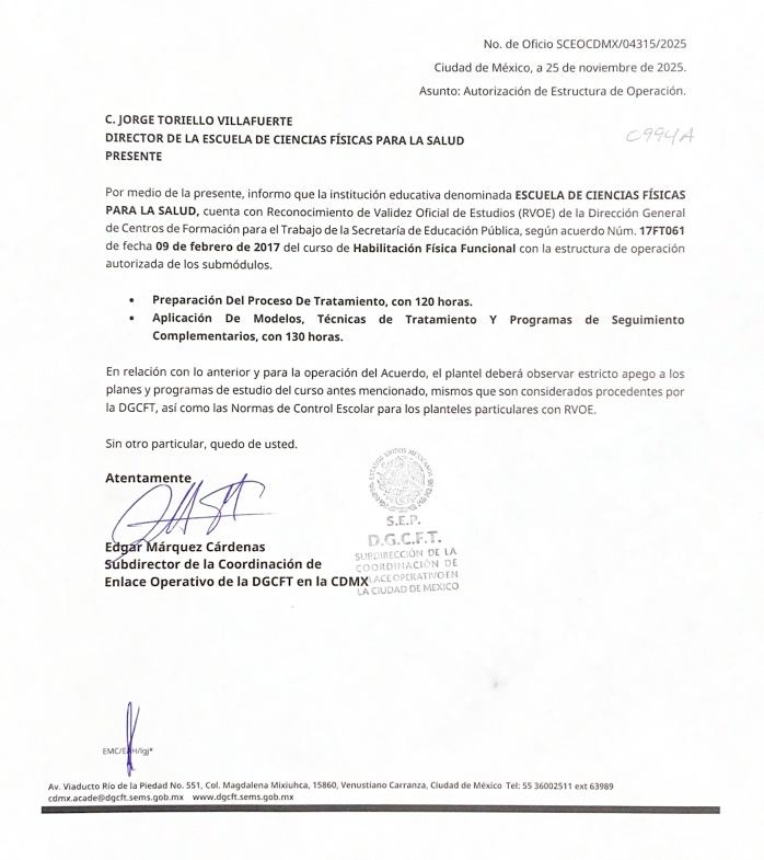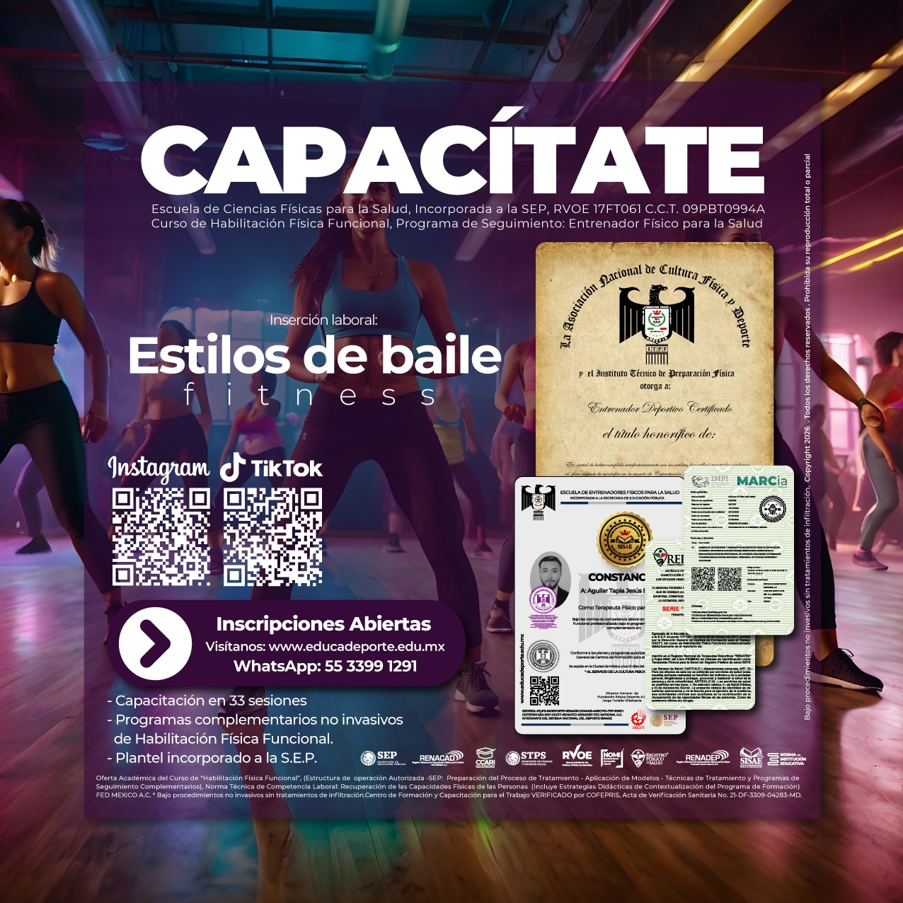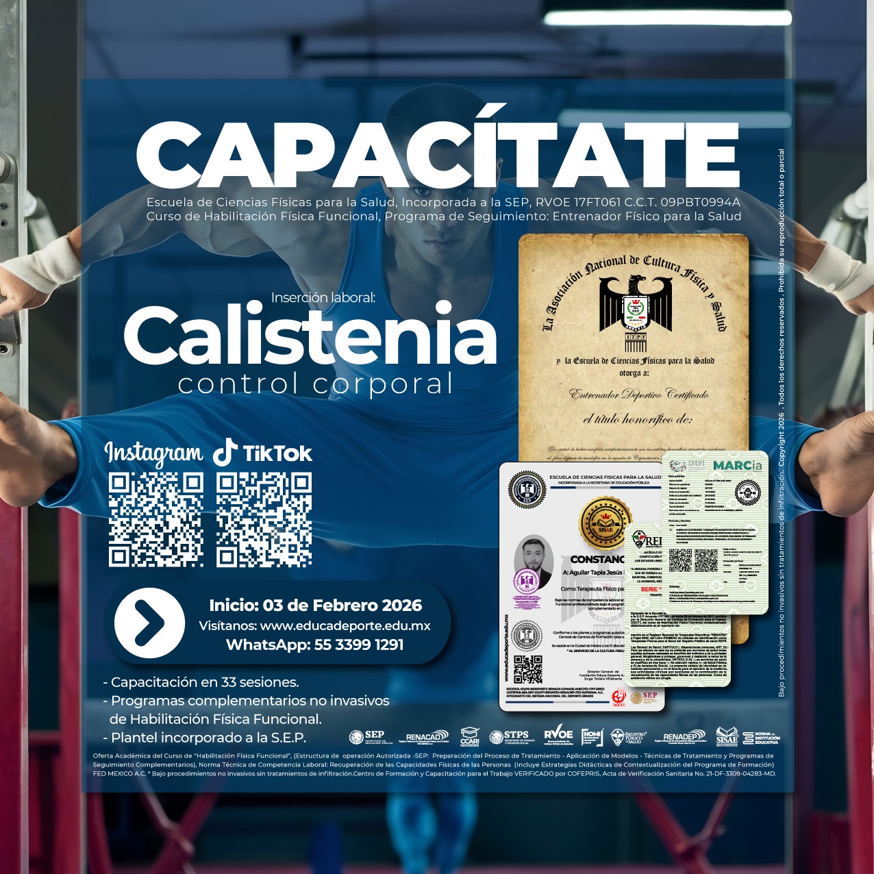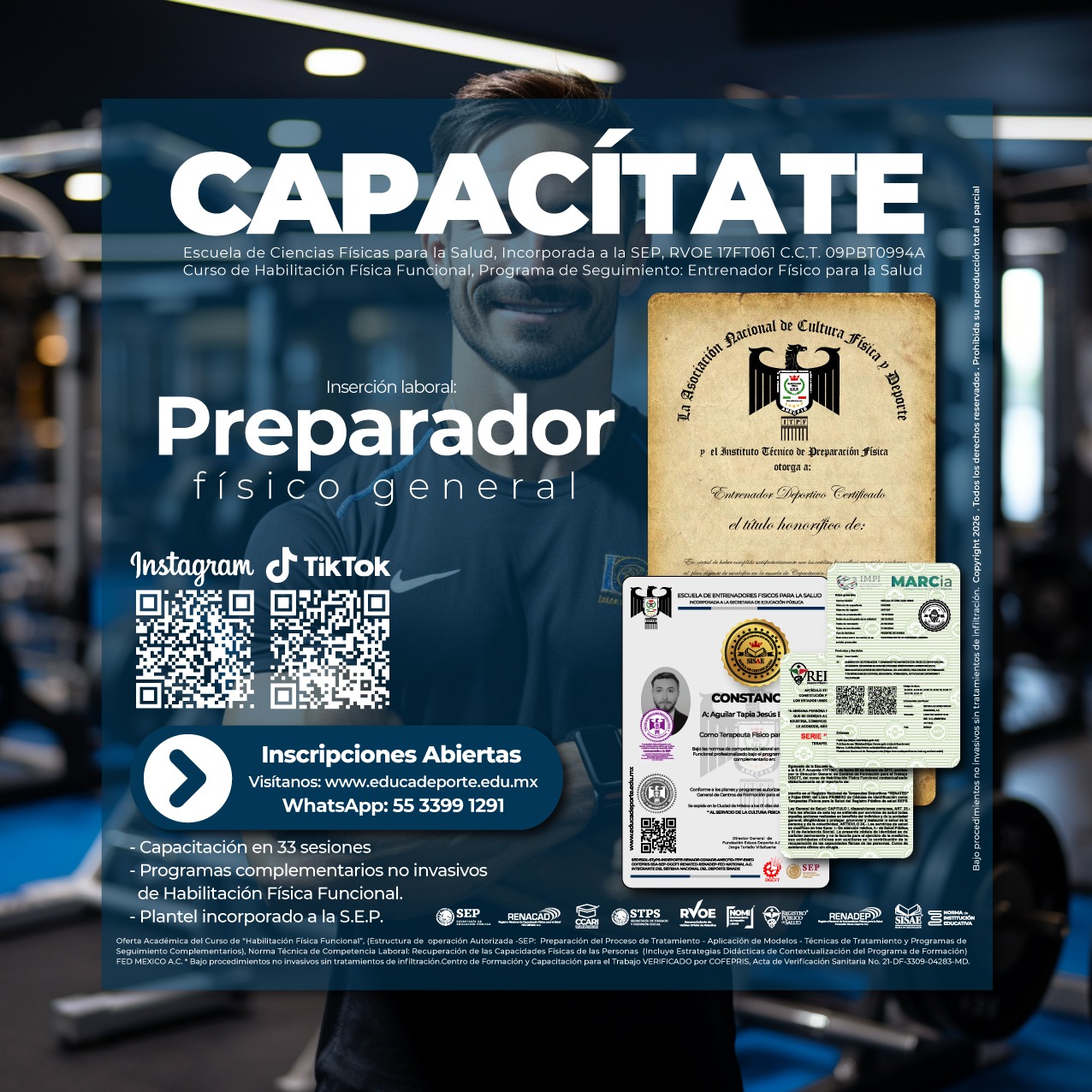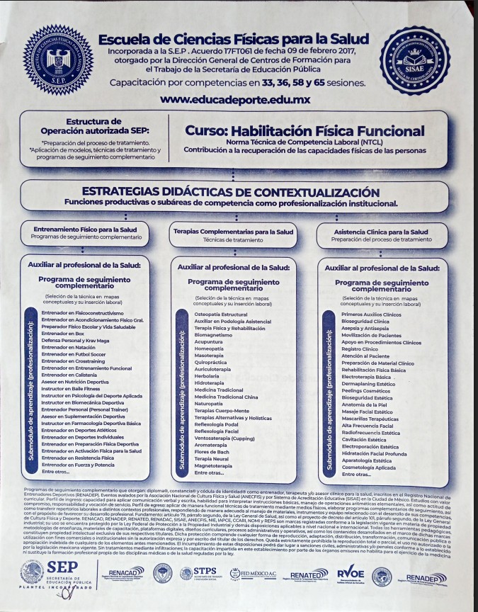 Como contextualización Didáctica del Curso de Habilitación Física Funcional. El nombramiento de Inserción laboral (NOMI) dentro de la Recuperación de las Capacidades Físicas de las Personas del «Curso de Habilitación Física Funcional» de la «Escuela de Ciencias Físicas para la Salud» incorporada a la S.E.P; y conforme a la Estructura de Operación del Curso incluye la Aplicación de Modelos, Técnicas de Tratamiento y Programas de Seguimiento Complementarios, el Plantel te ofrece la contextualización que como «momento didáctico» del curso, relaciona su Funcion Productiva en tres Subáreas de Competencia como Profesionalización Institucional a tu elección: 1.- Entrenador Físico para la Salud. 2.- Terapeuta Físico para la Salud. 3.- Auxiliar Clínico para la Salud. Cada subarea de competencia dentro del curso de habilitacion fisica funcional, a traves de la contextualizacion didactica, cuenta con diversos repertorios laborales a elegir, conforme a la Guía de aprendizaje para Habilitación Física Funcional emitida por la Dirección General de Centros de Formación Para el Trabajo de la Secretaria de Educación Pública, los planes de trabajo fueron diseñados adaptándose a las necesidades del alumnado, bajo un esquema de integración continua de carácter modular que permite a los aspirantes a integrarse de forma continua a las diversas Áreas de Profesionalización, por lo que brinda la oportunidad de concluir su preparación en un periodo de 33 a 56 semanas (250 hrs. teórico-practicas). Repertorios Laborales a elegir como Entrenador Físico para la Salud.